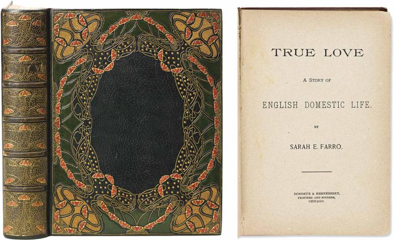 Guild of Women Binders, exhibition binding of A.F. Pollard’s Henry VIII, London, 1902. Sold for $12,350 (left). Sarah E. Farro, True Love, a Story of English Domestic Life, Chicago, 1891. Sold for $8,750 (right).