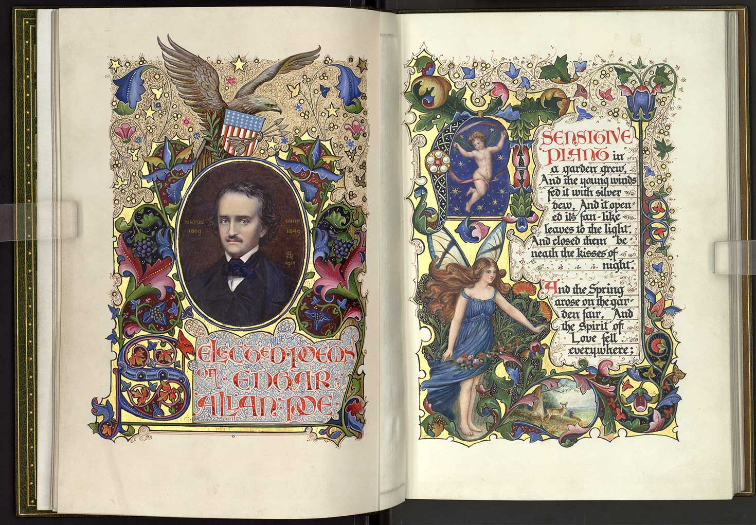 An illuminated manuscript of Poe’s Selected Poems by Alberto Sangorski on sixteen vellum pages. A particularly fine title page has a portrait miniature of the poet—signed AS 1911—and a striking eagle and “stars and stripes” shield. With four full-page and other miniatures, it was bound by Riviere in green morocco / Shelley’s The Sensitive Plant and Other Poems is another Alberto Sangorski manuscript from the Phoebe Boyle collection, on no fewer than sixty-two vellum pages illuminated throughout. The title page has a portrait miniature, two miniatures, as well as numerous borders, and illuminated and colored initials. It was bound by Riviere in brown morocco.
