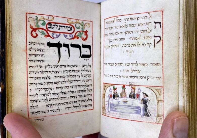 Featured on the decorated title page are Moses holding the Tablets of the Law, and Aaron, his brother, dressed in high priest vestments. This is a frequent motif in 18th century Hebrew manuscripts and has its roots in the ornamented pages of earlier imprints from Amsterdam and other European printing centres. The animal, celestial and vegetal illustrations enclosed within mauve and blue ink medallions are part of the Perek Shirah hymn. Several illustrations show families around a table celebrating the Sabbath.