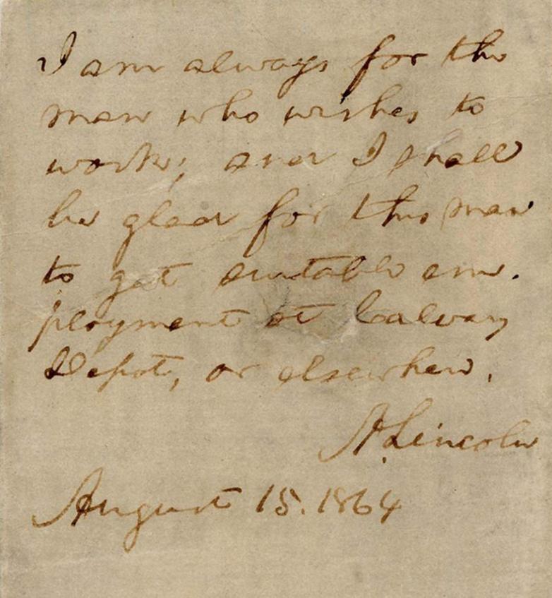 Also going under the hammer is an autograph endorsement signed by Abraham Lincoln dated August 15, 1864: “I am always for the man who wishes to work…” Lincoln’s endorsement is believed to be associated with a now-missing recommendation letter addressed to military authorities at a Washington, D.C. cavalry depot.