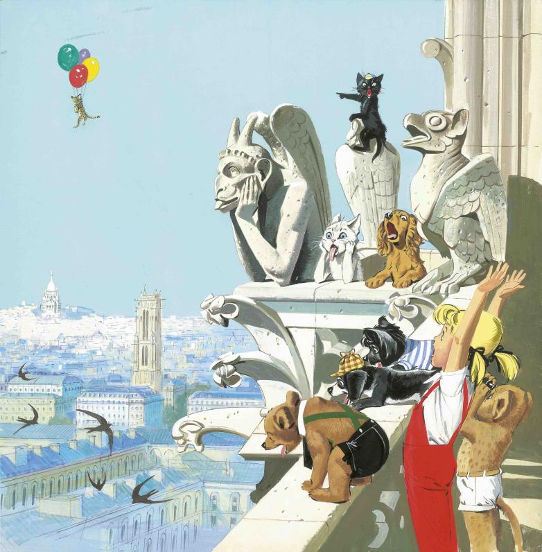 A beautiful panorama of Caroline adventures, which are both educational and fun, will also be presented at the auction. Twenty-two original drawings depict the adventures of the young heroine who sometimes explored the capital city--admiring the breath-taking view from the top of Notre-Dame cathedral or at the foot of the Eiffel Tower--while others recount her going back to Prehistoric times, travelling through Europe or even going on an expedition to the Moon, always accompanied by her four-legged friends who end up getting into mishaps (estimate: €3,000 - 5,000 / €4,000 - 6,000).