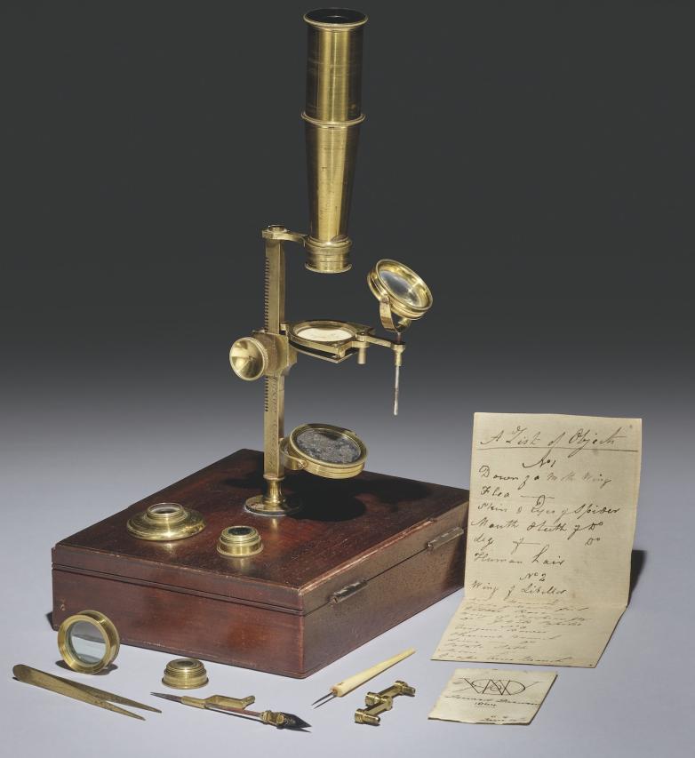 The Darwin Family Microscope: A Gould-type microscope by Cary, with accessories in original mahogany box.