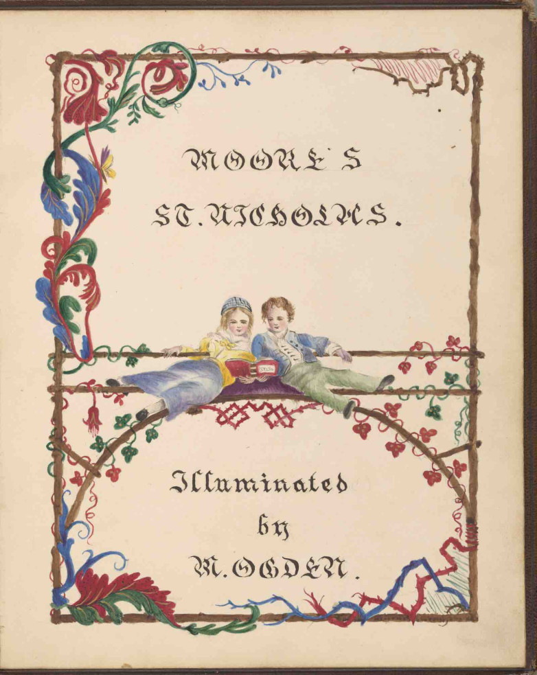 This manuscript was illustrated by Moore’s daughter, Mary Clarke Moore Ogden (1819–1893), and given to her husband John Doughty Ogden as a Christmas present in 1855. The volume features the first color illustrations of the poem, set as miniature vignettes within the decorative border surrounding the text. On one of the pages she depicted the house in the Chelsea section of New York City where she and her eight brothers and sisters heard the poem recited by her father every Christmas. Other notable features include the original text of the poem’s second-to-last line, reading “Happy Christmas to all,” which would later be changed to “Merry Christmas to all.” The volume has been treasured by the Ogden family.