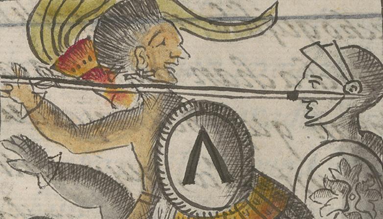 Mexica warrior, Book 12 of the Florentine Codex on the conquest of Mexico (detail). Ms. Mediceo Palatino 220, 1577, fol. 34.