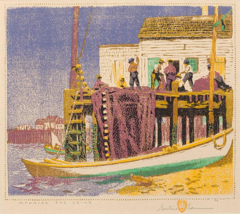 Gustave Baumann's Mending the Seine, 1917, color woodcut. Property from the Collection of Rhoda H. Clark and The Monastery Hill Bindery. Estimate: $10,000.00 - $15,000