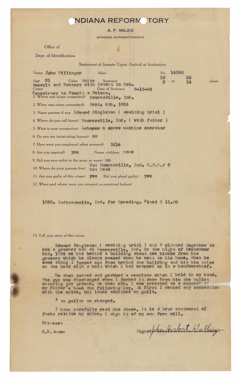 John Dillinger's signed plea and detailed description of his criminal plan ha sold for $34,370 at auction, according to Boston-based RR Auction. The historically significant one-page document signed "John Herbert Dillinger," circa 1924 Indiana Reformatory document lists his crimes and sentences.