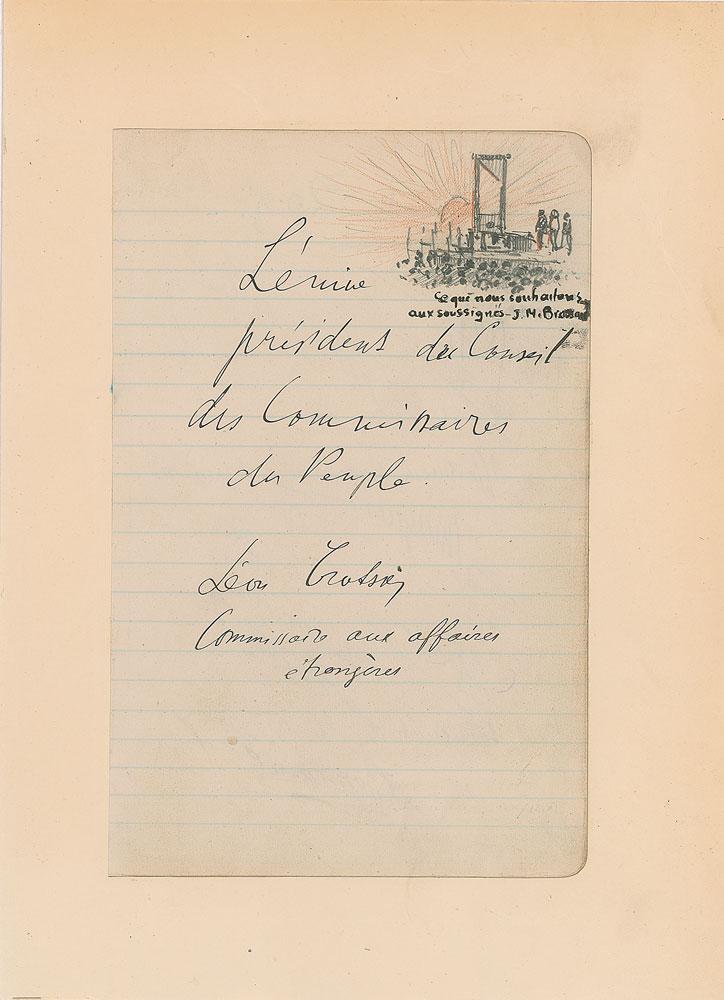 The fountain pen signatures, circa 1918, were removed from a notebook previously owned by Robert de Flers, French playwright and journalist who traveled to the Eastern front as the head of a French military mission, taking him to Romania, Moscow, and Petrograd, at which time he obtained the signatures of Lenin and Trotsky.