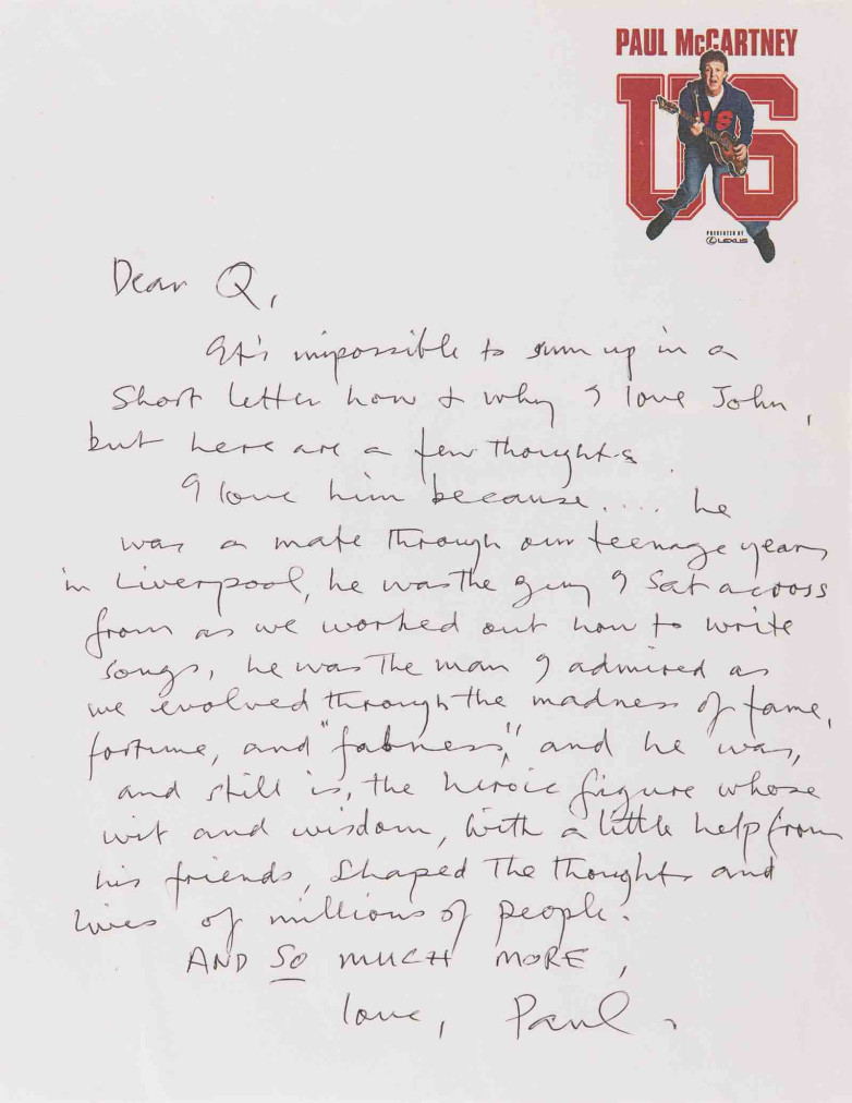 Leading the auction is a handwritten letter by McCartney on his custom 'Paul McCartney US' letterhead around 2005 to Q magazine, offering a reflection on John Lennon. Signed "love, Paul," the letter was discovered within the archives of Bauer Media following the publication's closure. "He was, and still is, the heroic figure whose wit and wisdom, with a little help from his friends, shaped the thoughts and lives of millions," writes McCartney. "It's impossible to sum up in a short letter how & why I love John…"