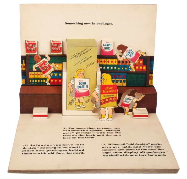 Collectible items for children also are on display, including Kellogg’s Funny Jungleland Moving Pictures (1932), a color triptych slice book that allows the reader to create fantastical animals by manipulating the illustrated flaps. By 1932, Kellogg’s had printed over 25 million copies in several iterations, available “while they last!” with the purchase of two packages of Corn Flakes at the grocer. The French company Phosphatine Falières advertised its fortified infant cereal with a series of colorful illustrated cards representing French provinces and colonies (ca. 1905), to be cut out and assembled with a pull-tab into a movable advertisement.