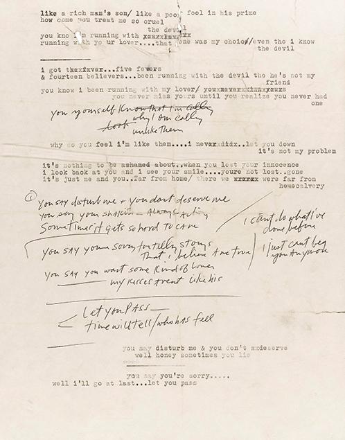 What gives this manuscript exceptional interest, however, is the presence of a second, abandoned song alongside the draft of this well-known piece. Typed over twelve lines across the top half of the page, the song contains a repeated refrain about “running with the devil”, before ending in a fragmentary state after some twelve lines with the words: "It's just me and you .. Far from home/ there we were far from calvery".