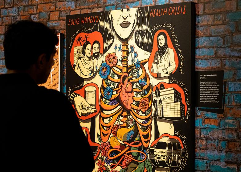 Visitor contemplating Aurat March, 2021 born-digital poster by Shehzil Malik.