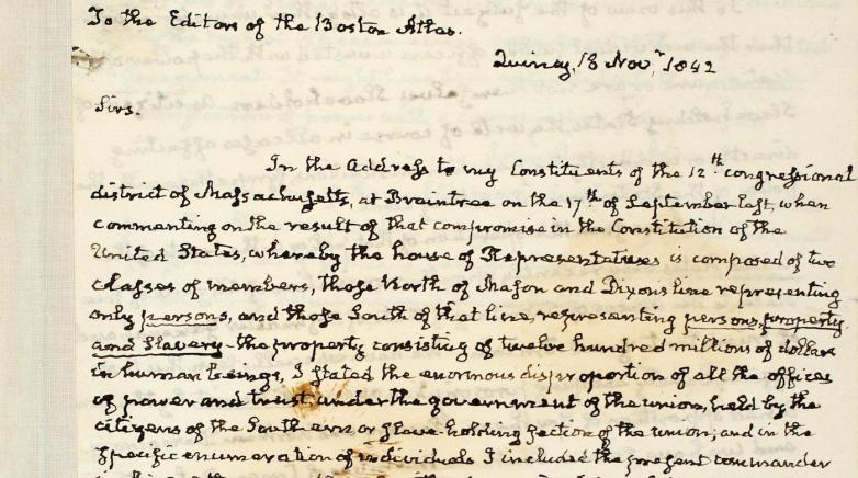 A November 18, 1842 John Quincy Adams letter to the editors of the Boston Atlas on the political ramifications of slavery, offered at Doyle NY this week.