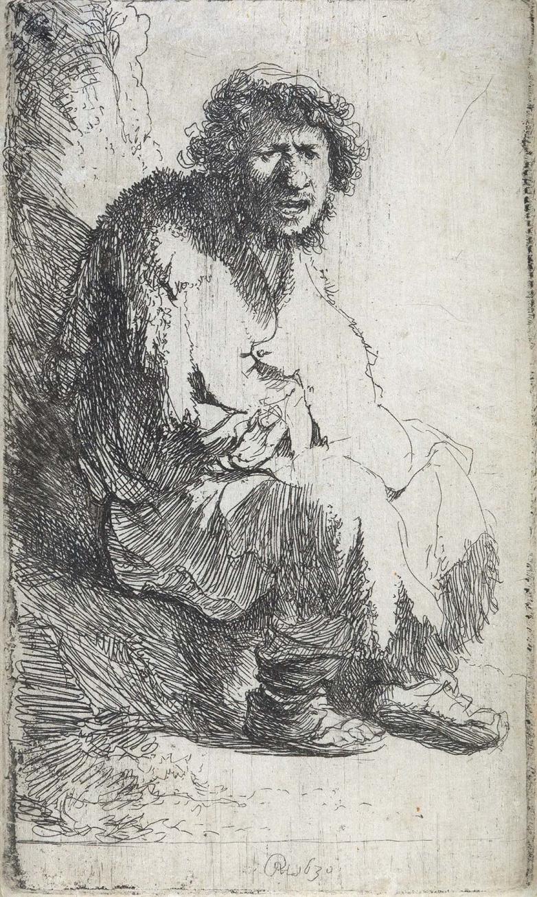Rembrandt van Rijn's A Beggar Seated on a Bank, 1630. From the John Villarino Collection. Estimate $20,000-30,000.