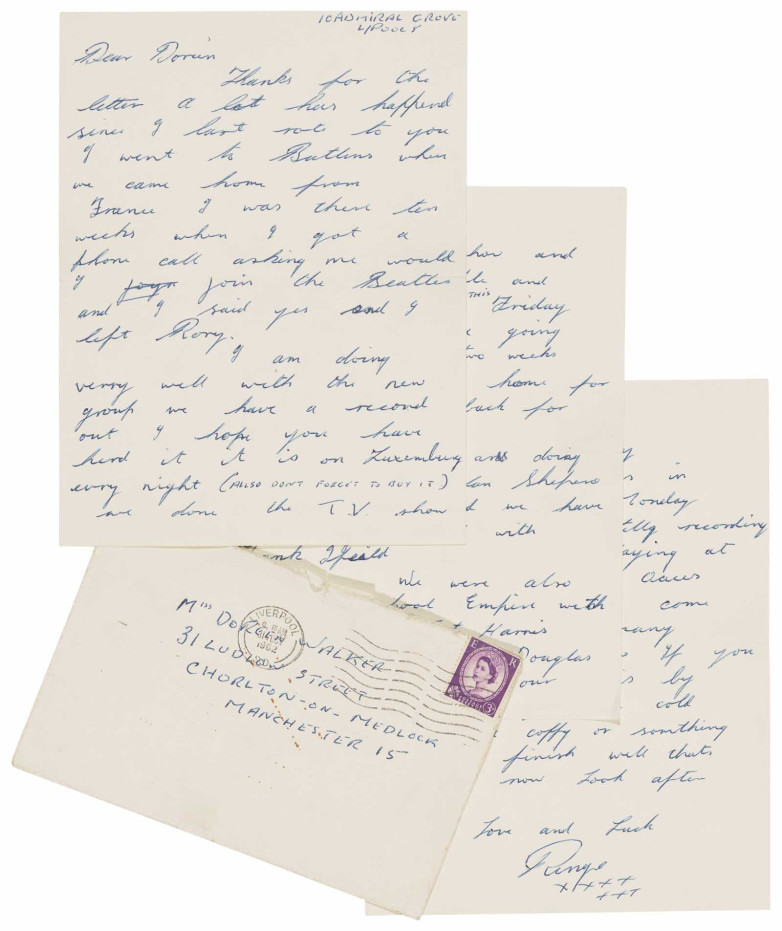 The three-page October 31, 1962, letter by Starr (Sir Richard Starkey) is one of five known to be written over the next 18 months to he recipient Doreen Walker who is believe to have met him during one of his Butlins residencies in summer 1961. Starr then lists upcoming Beatles tour dates with Helen Shapero, Eden Kane and Frank Ifield, a performance at the Liverpool Empire with Little Richard, and a television recording and performance in Doreen's home town of Manchester at the Oasis club. It has an estimate of £30,000 - £40,000.