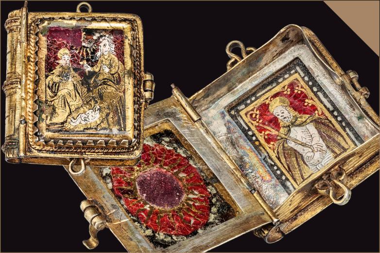 There are no words in this tiny book, but the engraved spine gives it an unmistakable codex shape. Made in Southern Germany c. 1550, this fascinating and unique pendant in the form of a book instead showcases devotional artwork and likely harbored a relic as well.