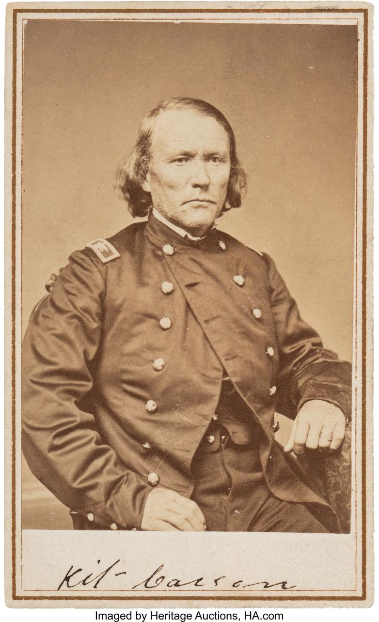 Dallas, TX – A signed carte de visite from legendary American frontiersman Kit Carson is just one of dozens scarcely seen period photographs highlighting the Bret J. Formichi American Civil War Rarities Collection, offered Oct. 23 by Heritage Auctions. The Formichi collection features fine examples of cartes de visite, many signed, as well as letters and documents from strong as well as little known personalities behind the bloody conflict.