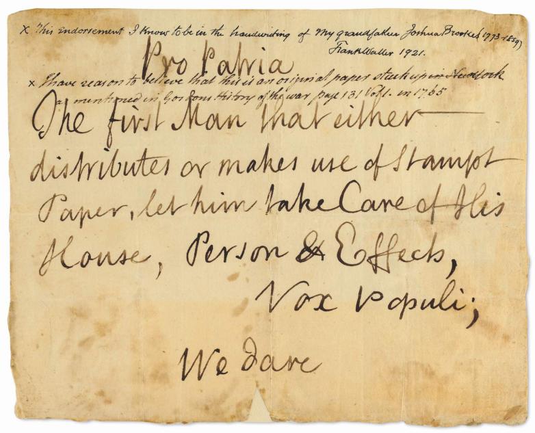Stamp Act defiance placard, one of just two known surviving copies, offered at Christie's New York this week.