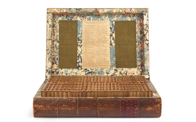 One of two faux-book chests containing a travelling library of John Bell's sets of British theater and poetry (109 volumes total), offered as part of Justin Schiller's collection at Freeman's | Hindman this week.
