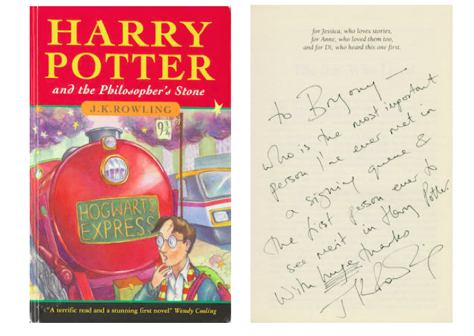 First edition of Harry Potter and the Philosopher's Stone, inscribed by the author "to Bryony... the first person ever to see merit in Harry Potter. With huge [underlined 4 times] thanks. J.K. Rowling", Bloomsbury, 1997.
