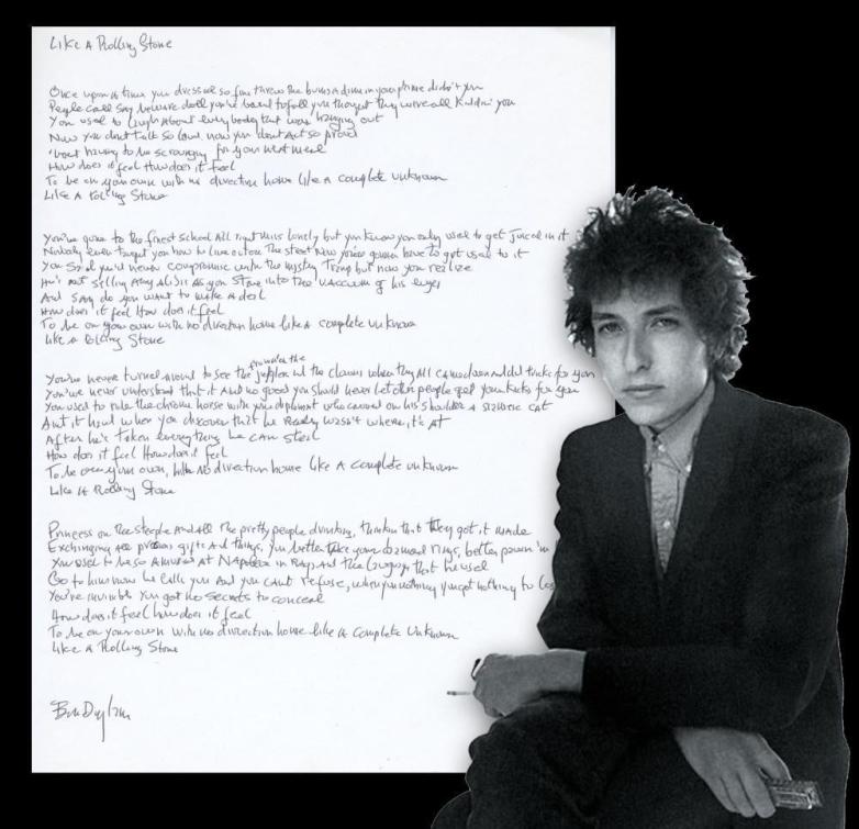 Bob Dylan’s handwritten and signed lyrics to the classic rock song Like a Rolling Stone, on an 8 ½ by 11-inch sheet, authenticated by Dylan’s manager, Jeff Rosen (est. $75,000-$85,000).