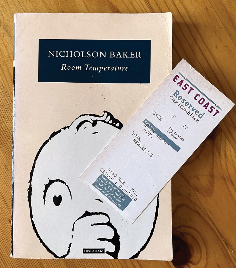 Finders, Keepers includes a chapter on books Nicholas Royle collected with train tickets left inside, such as this copy of Nicholson Baker’s Room Temperature.