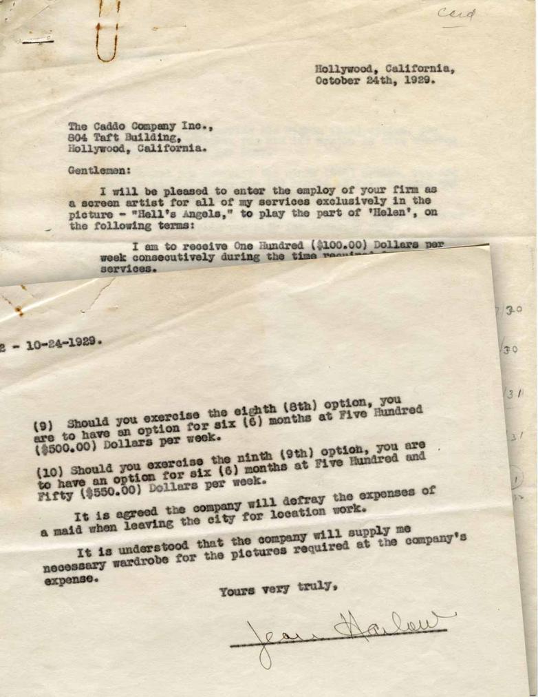 Jean Harlow's contract to play Helen in "Hell's Angels" dated October 24, 1929 (est. $2,500–3,500).
