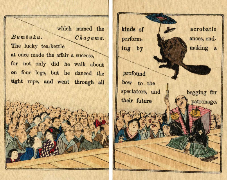 If the sweetly illustrated tale of the magical tea kettle seems only charming at first blush, exhibition visitors will soon learn that chirimen books were, in fact, potent vehicles for cultural expression and exchange. After almost 300 years of limited contact with the West, Japan began rushing toward Westernization in the last half of the nineteenth century while simultaneously aiming to articulate its own distinctive national identity. Chirimen books are works of cross-cultural collaboration that emerged within this context of rapid transformation.