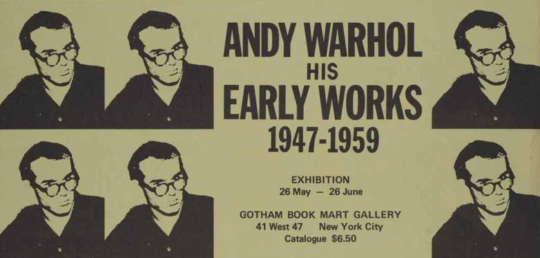 An exhibition broadside for Andy Warhol His Early Works 1947-1959, held at the Gotham Book Mart Gallery in 1971.