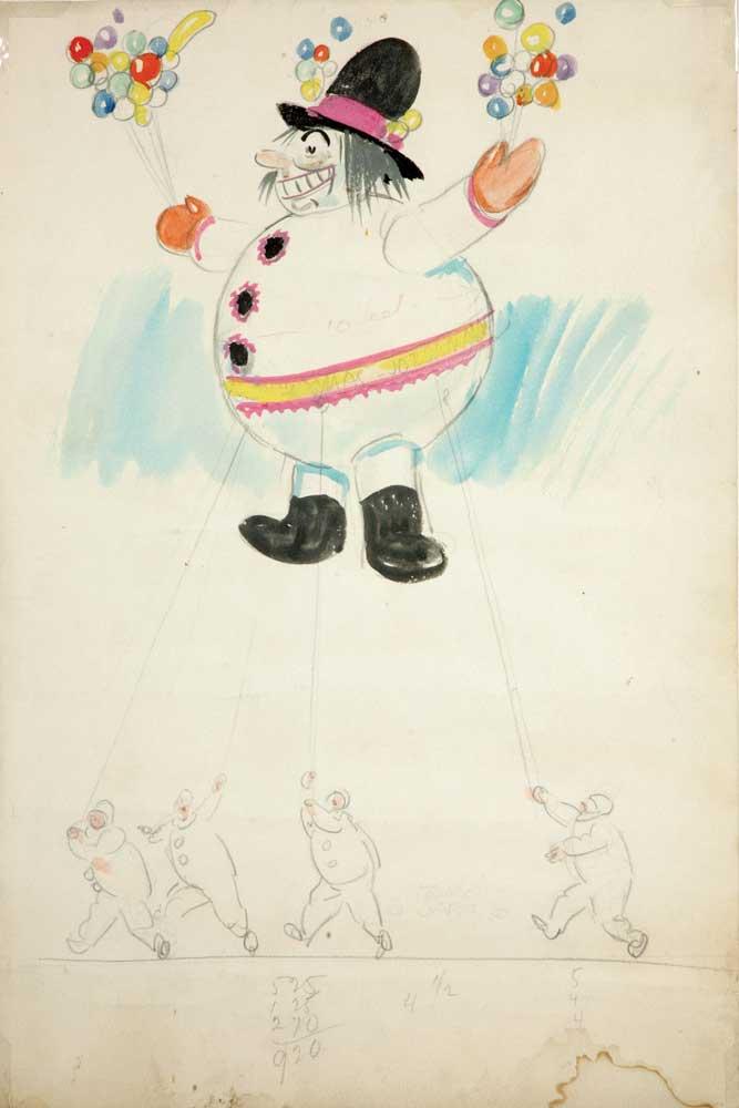 A pencil, watercolor, and gouache sketch by Tony Sarg for a clown balloon.