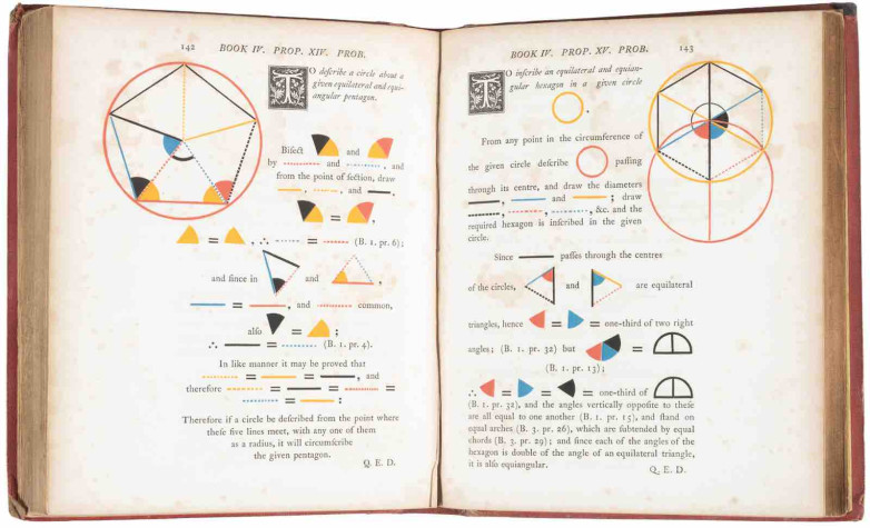 Also going under the hammer is Oliver Byrne’s The First Six Books of the Elements of Euclid from 1847 (estimate: $10,000 - $15,000) which uses four-color printing as a teaching aid, transforming the geometric references into visual concepts to demonstrate proofs rather than using letters to label angles/edges, a forerunner to today's information graphics.