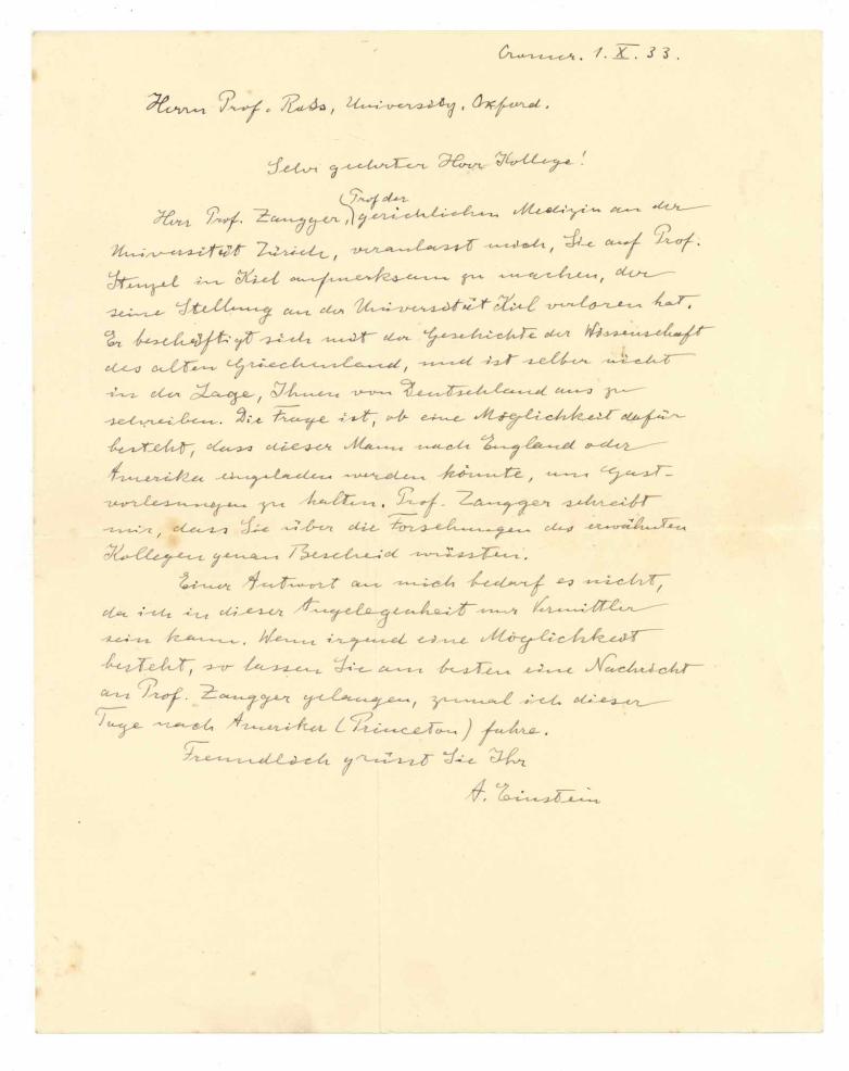 Einstein suggests Ross contact Zangger directly “especially as I will be soon travelling to America (Princeton)".