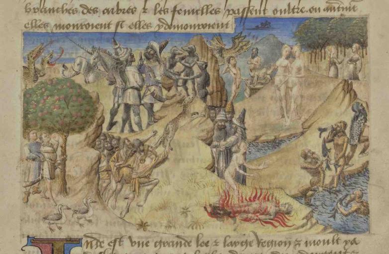 Written in medieval France as an encyclopedia of global wonders, the text weaves together tales of peoples based on ancient sources, medieval folklore, and the supposed travels of eyewitnesses. The global locations highlighted in the manuscript were paired with scenes of fantastical stories and creatures that medieval Europeans found captivating and bizarre. The places seen in the illuminations blurred the line between fact and fiction, with the locales situated far from Europe often viewed as dangerously different.