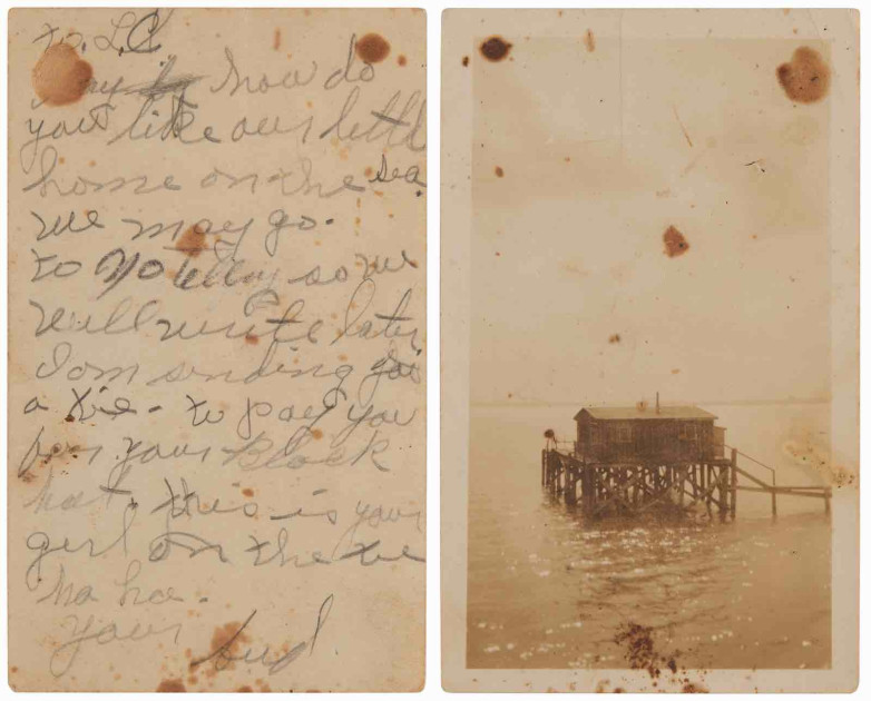 The Old West, Outlaws, Lawmen, and Gangsters sale closing on May 22 features a handwritten letter from Clyde Barrow to his brother, scrawled on the back of a photograph of one of the gang's Gulf Coast hideouts. In the note, Barrow jokes about their seaside hideout and includes a tie as payment for his brother's black hat.