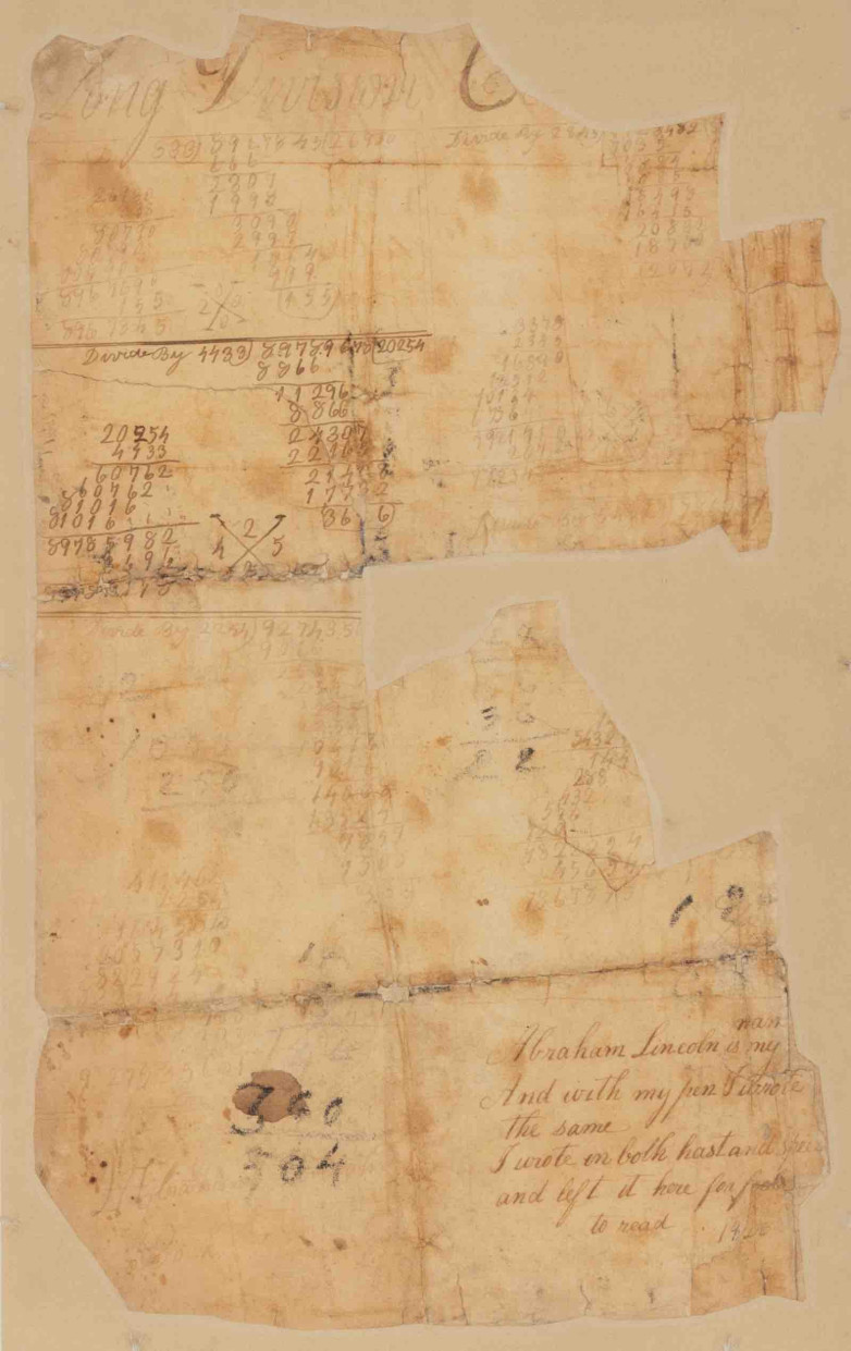 * the earliest known example of Lincoln’s writing, dating from when he was about 15 years old, a double-sided sum book leaf covered in long division practice sums and signed three times. In one corner he wrote: “Abraham  Lincoln is my name / And with my pen I wrote / the same  / I wrote in both hast and speed / and left it here for fools  / to read” (estimate: $300,000 -