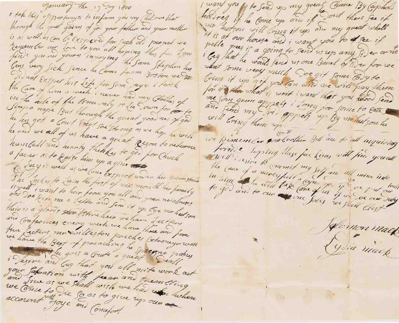 Personal letter from Joseph Smith’s maternal grandmother, Lydia Mack, among papers of his New Hampshire uncle, 1777 – 1822. Sold for $32,500.
