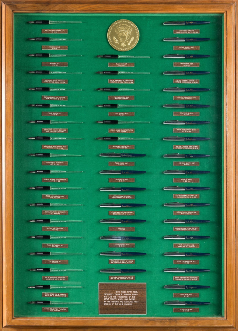 The John F. Kennedy and Lyndon B. Johnson: Collection of Presidential Bill Signing Pens features 50 fountain pens used by the country’s 35th and 36th presidents. Among the bills signed into law with pens from this collection are the Civil Rights Act, which Johnson signed July 2, 1964, the Minimum Wage Act (May 1961), the Peace Corps Act (September 1961), the Clean Air Act (December 1963), the Food Stamp Act, the Voting Rights Act (August 1965), Immigration Act (October 1965) and the 25th Amendment (Presidential Continuity) to the Constitution (February 1967).