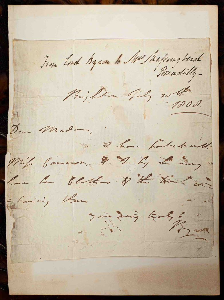 The letters were written in 1805 and 1808 to his London landlady and moneylender Mrs Massingberd, and feature the polite Cambridge University undergraduate arranging his lodgings as well as the notorious libertine dismissing a mistress.