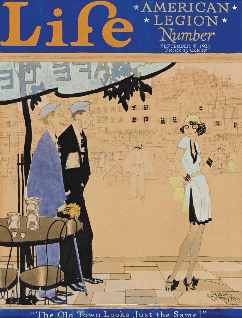 Phillips is one of the most recognizable illustrators of the first half of the twentieth century. His first cover for Life appeared in 1908, the same year he debuted his signature design, which came to be known as “the fadeaway girl.” The fadeaway style refers to Phillips’s masterful use of shapes and edges to suggest a silhouette. In essence, a woman’s figure is rendered with a detailed face, arms, and legs, but the clothing is a solid, flat color that blends into the background. The defined elements are placed within the negative space in such a way as to suggest volume and form.