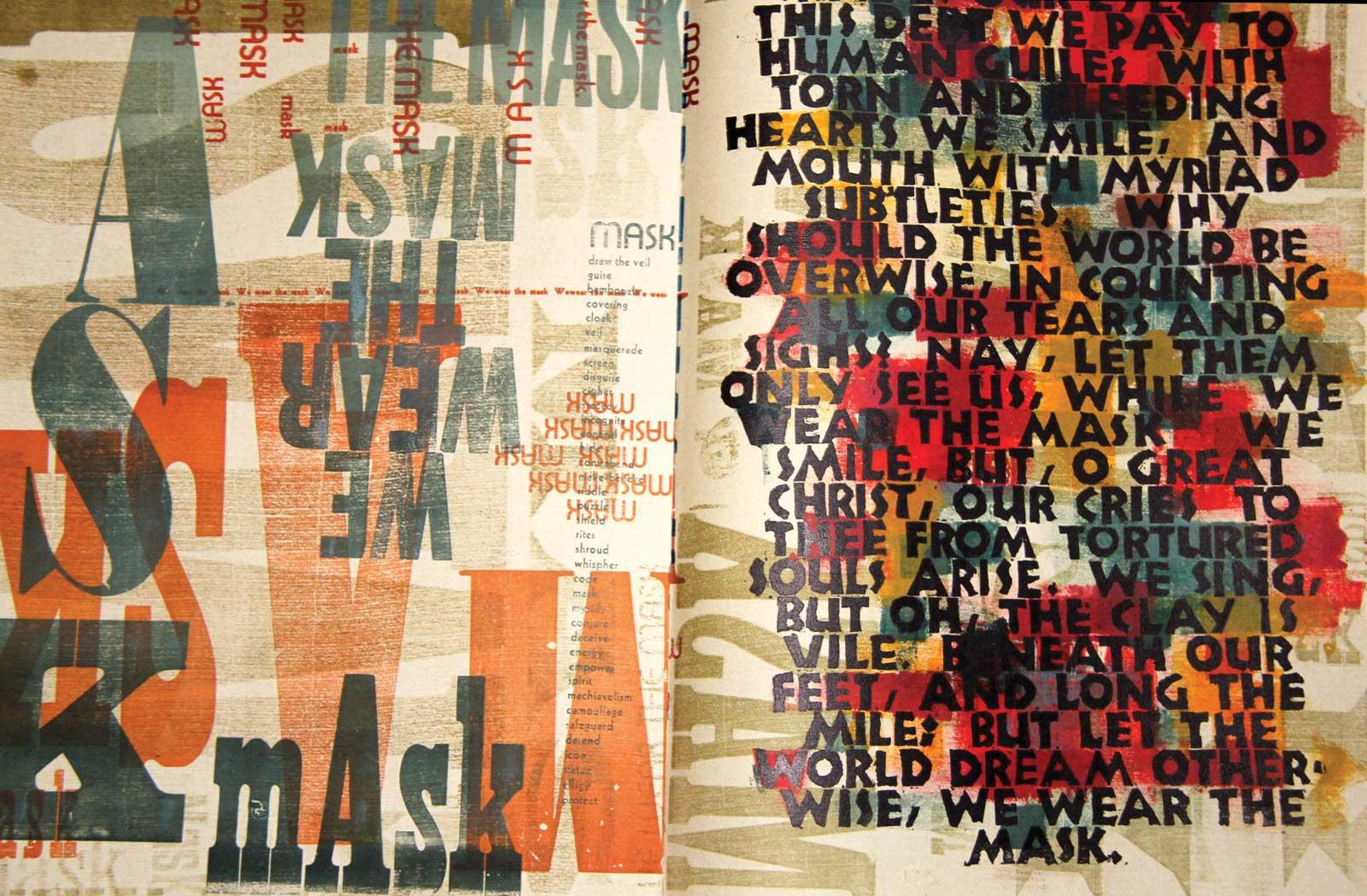 From Amos P. Kennedy Jr.’s Mask Book. Said Kennedy, “The book is an early experiment in layering text. All the layers relate to the mask.”