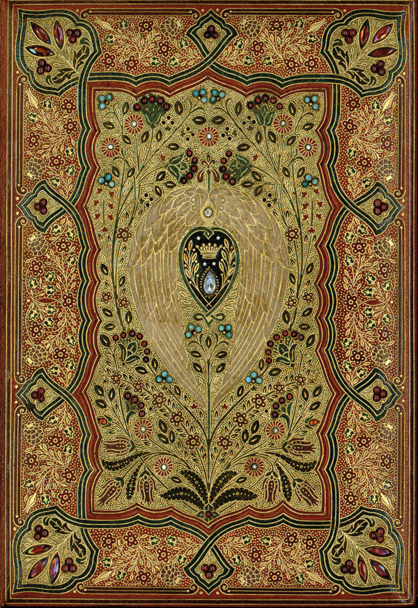 As for Francis and George, from 1909–1911, they worked on the “Great Omar”—a luxurious, large-format binding of the Rubaiyat with six separate designs on the covers, doublures, 1,050 jewels, and more than 5,000 morocco inlays. Alas, this book was lost on the RMS Titanic in 1912, and then, a few months later, in July of 1912, Francis drowned saving another swimmer’s life. Sutcliffe carried on the business, producing some very beautiful jeweled bindings, but the advent of World War I meant that the glory days were over. He died in 1936, and the firm changed hands and names.