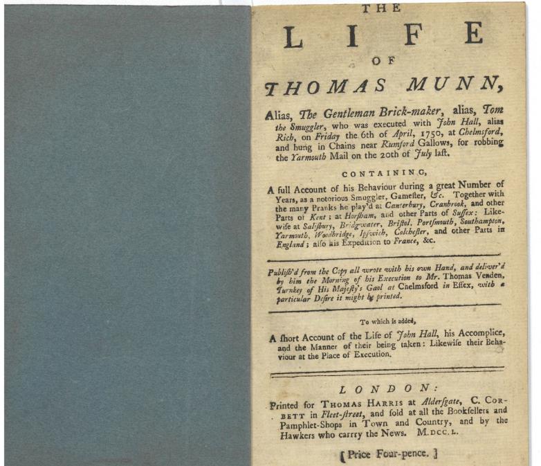 One of five copies of the 1750 booklet, The Life of Thomas Munn, alias, the Gentleman Brick-maker, alias, Tom The Smuggler….
