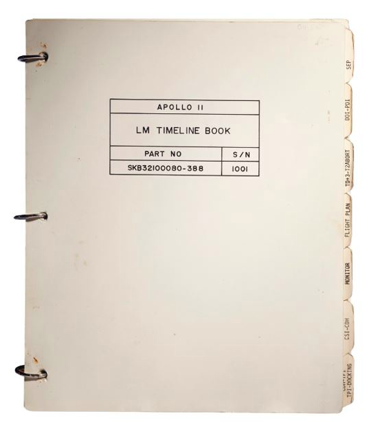 Apollo 11 Lunar Module Timeline Book. [Houston]: Manned Spacecraft Center, Flight Planning Branch, June 19-July 12, 1969., Flown aboard the LM Eagle and annotated by Neil Armstrong and Buzz Aldrin as they landed on the moon. Estimate: $7,000,000-9,000,000.