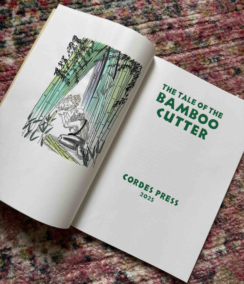 From Cordes Press, a London-based publisher of limited-edition letterpress books run by Kevin Cordes, this is a Japanese folk tale about a baby, The Moon Child, sent to earth by the Gods to experience the human world for when she becomes one to a poor old childless couple. Printed by James Freemantle and bound by Roger Grech with two full-colour handpainted images and five colour vignettes by Ewa Kropiewnicka in each of the 40 available copies which come in an embossed slipcase.