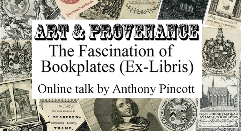 Oxford, England — On June 22nd at 6:30 P.M. BST, Anthony Pincott, for many years a bookplate collector and member of The Bookplate Society will give an online talk entitled "Ex-libris Art and Provenance - The Fascination of Bookplates.”