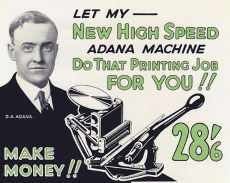 The first Adana advertisement appeared on November 25 1922 in The Bazaar, Exchange & Mart, offering readers a “massively constructed” press capable of printing everything “from a chemist’s label to an illustrated magazine”. In truth it was a simple wooden box with a hinged lid, based upon the Victorian Parlour Press.