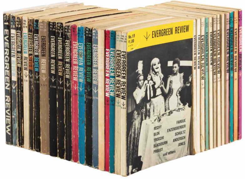Also featured is a rare complete run of the influential literary magazine Evergreen Review which regularly presented new work by Jack Kerouac, Allen Ginsberg, and Gary Snyder. With numerous issues signed by contributors, the full run spans the mid-1950s through the mid-1980s (estimate: $1,000 - $1,500).