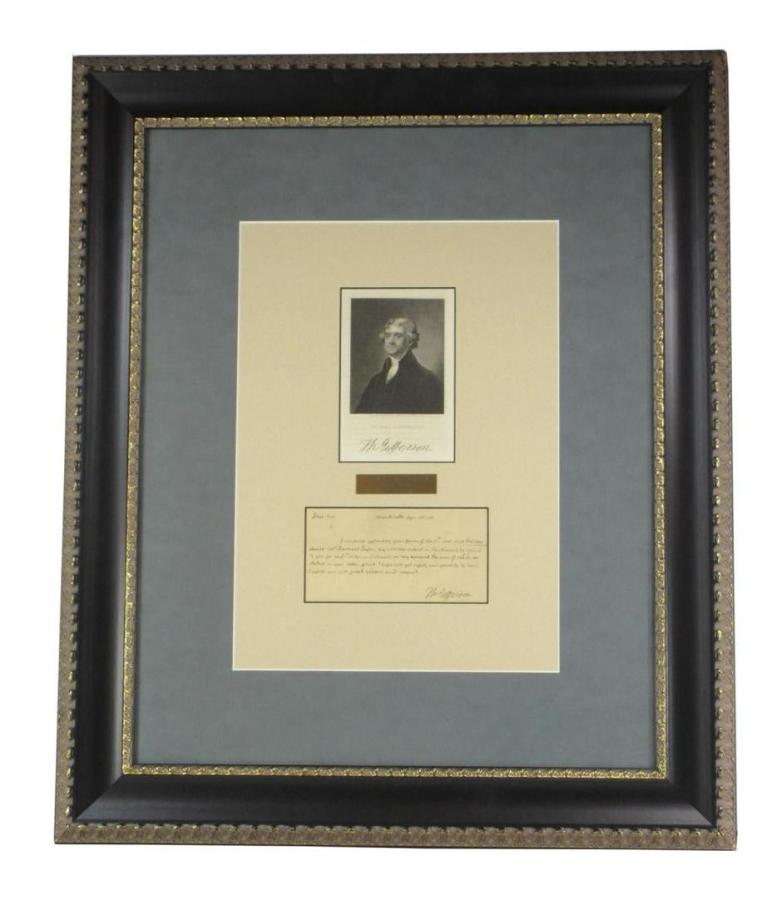 Single-page letter handwritten by Thomas Jefferson on April 18, 1826 (six weeks prior to his death), in a slate blue suede mat and framed with an engraved portrait (est. $7,500-$8,500).