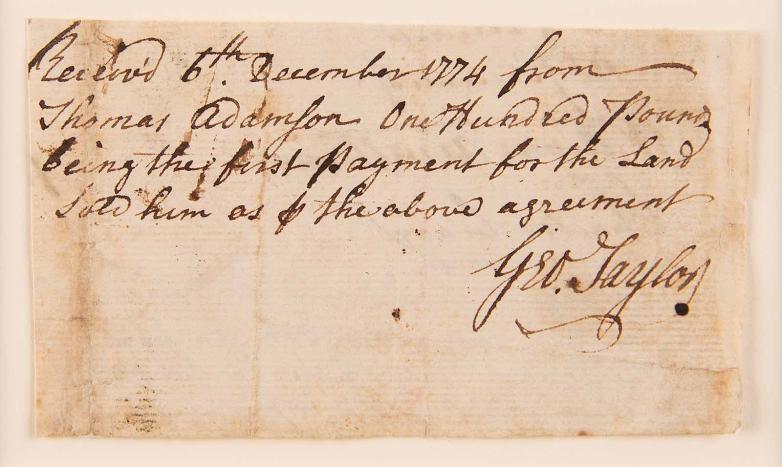The autographed document features a receipt penned by Taylor: "Receiv'd 6th December 1774 from Thomas Adamson One Hundred Pounds being the first payment for the Land sold him as of the above agreement." Notably, a fragment of the 'above agreement' of the land deal appears on the reverse, signed by William Armstrong and Charles Craig.