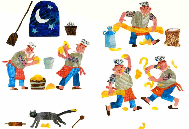 Eric Carle, “Walter worked all day and into the night.” Walter the Baker, 1995. Collage of acrylic-painted tissue paper with pen and ink on illustration board.