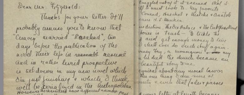 The four-page handwritten letter, undated but, circa late 1920, to "Mr. Fitzgerald,” in Paterson, NJ, replying to commentary on This Side of Paradise, in which the protagonist 'Amory Blaine' was based upon himself, and the character 'Rosalind Connage' was based on Zelda.